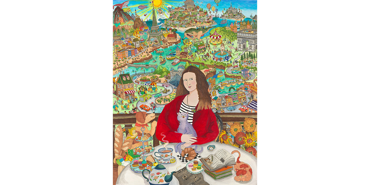 優しく鮮やかな色彩と温かな物語のモチーフで描き出す作品は、日常のささやかな喜びやユーモアを、名画や歴史的モチーフの現代的再解釈として表現しています。