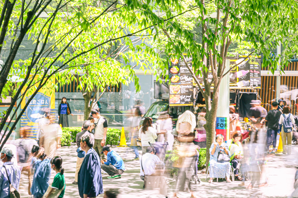 東京国際フォーラムの名物ともいえる、多数のキッチンカーからなる屋台村。新緑が清々しい地上広場で、世界各国のメニューが楽しめます。