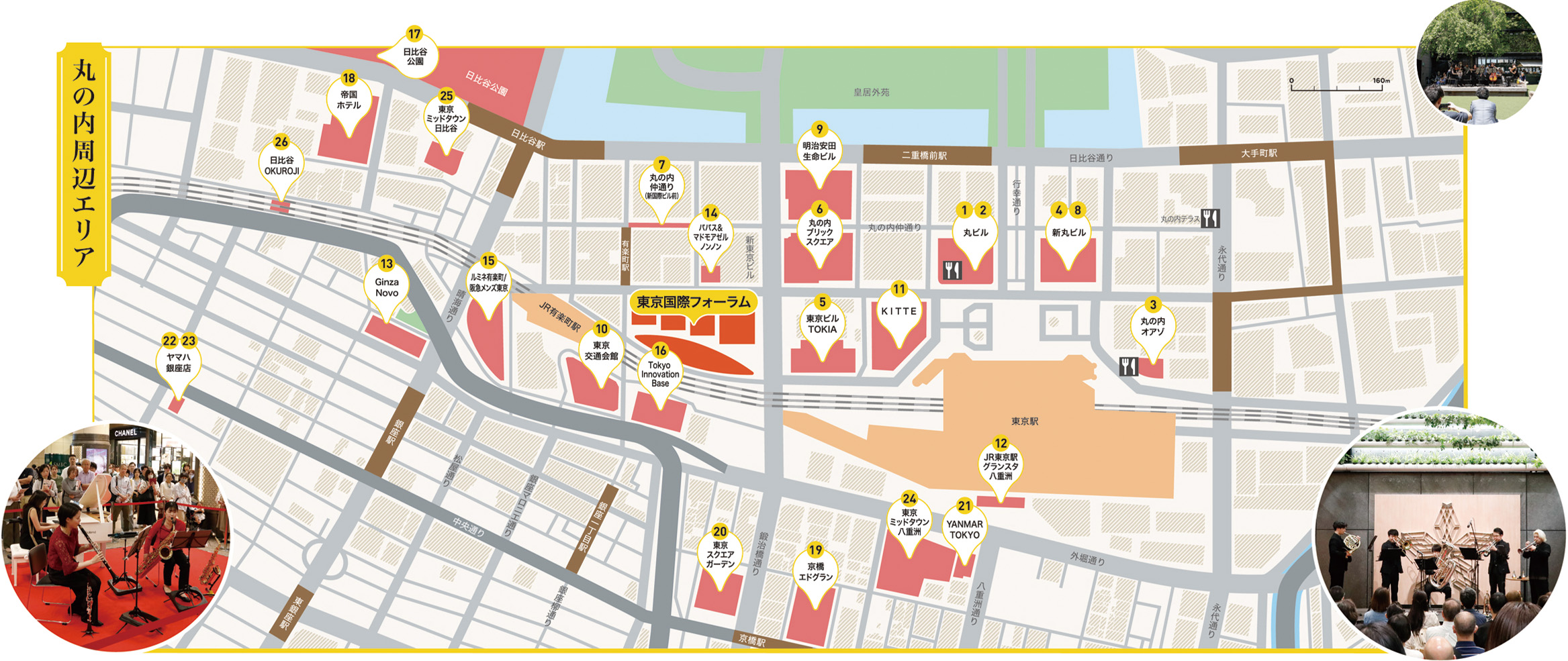 1 丸ビル 1階 外構部 / 2 丸ビル 1階 マルキューブ / 3 丸の内オアゾ 1階 〇〇(おお)広場 / 4 新丸ビル 3階 アトリウム / 5 東京ビル TOKIA 1階 ガレリア / 6 丸の内ブリックスクエア 一号館広場 / 7 丸の内仲通り(新国際ビル前) / 8 新丸ビル 1階 北西外構部 / 9 明治安田ヴィレッジ 1階 アトリウム / 10 東京交通会館 1階 ピロティ 三省堂書店前 / 11 KITTE 1階 アトリウム / 12 JR東京駅 八重洲地下中央口 改札外 グランスタ八重洲 B1 GODIVA café Tokyo前 / 13 GinzaNovo 屋上 The Mint Ginza The Garden / 14 パパス&マドモアゼルノンノン 丸の内本店 / 15 ルミネ有楽町/阪急メンズ東京(有楽町マリオン センターモール) / 16 Tokyo Innovation Base 1階SQUARE-2 / 17 日比谷公園 芝庭広場(HIBIYA LIVE FESTIVAL) / 18 帝国ホテル 東京 本館3階 富士の間 / 19 京橋エドグラン 地下1階大階段 / 20 東京スクエアガーデン 地下1階駅前広場 / 21 YANMAR TOKYO 地下1階 HANASAKA SQUARE / 22 ヤマハ銀座店 1F ブランド体験エリア / 23 ヤマハ銀座店 B2F ヤマハ銀座スタジオ / 24 東京ミッドタウン八重洲 1階 ガレリア前(外堀通り側)歩道エリア / 25 東京ミッドタウン日比谷 日比谷ステップ広場 / 26 日比谷 OKUROJI