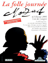 1995年、この音楽祭の創始者であるルネ・マルタンが初めて「ラ・フォル・ジュルネ」を企画したときのテーマは「モーツァルト」。まず頭にあったのは、複数の会場で2日間ほど24時間絶え間なくコンサートを開催し、祝祭的な音楽祭にしたい、ということでした。そのネーミングを考えたとき、インスピレーションを受けたのがボーマルシェの戯曲「ラ・フォル・ジュルネ(熱狂の日)、あるいはフィガロの結婚」です。1784年に発表され、モーツァルトもオペラの元にしたこの戯曲は、当時の価値観を覆す革命的なものでフランス革命の導火線になったともいわれます。「ラ・フォル・ジュルネ」というタイトルこそ、まさにルネ・マルタンの夢、人々をクラシック音楽から阻もうとする様々なバリアを取り去りたいという思いにぴったりの言葉だったのです。ちなみに第1回ラ・フォル・ジュルネのポスターは、モーツァルトが鼻に親指をつけて指を広げた、ヒトを小馬鹿にした仕草のシルエット。常識を覆そうとしていた、破天荒なモーツァルトのイメージです。