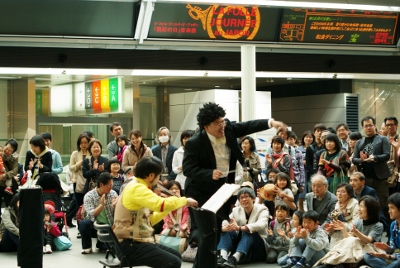 LFJの朝はこの人がいないと始まらない。 好田タクトさんのマエストロ芸がガラス棟B1インフォメーションカウンター前で、朝イチから盛り上がってますよー。